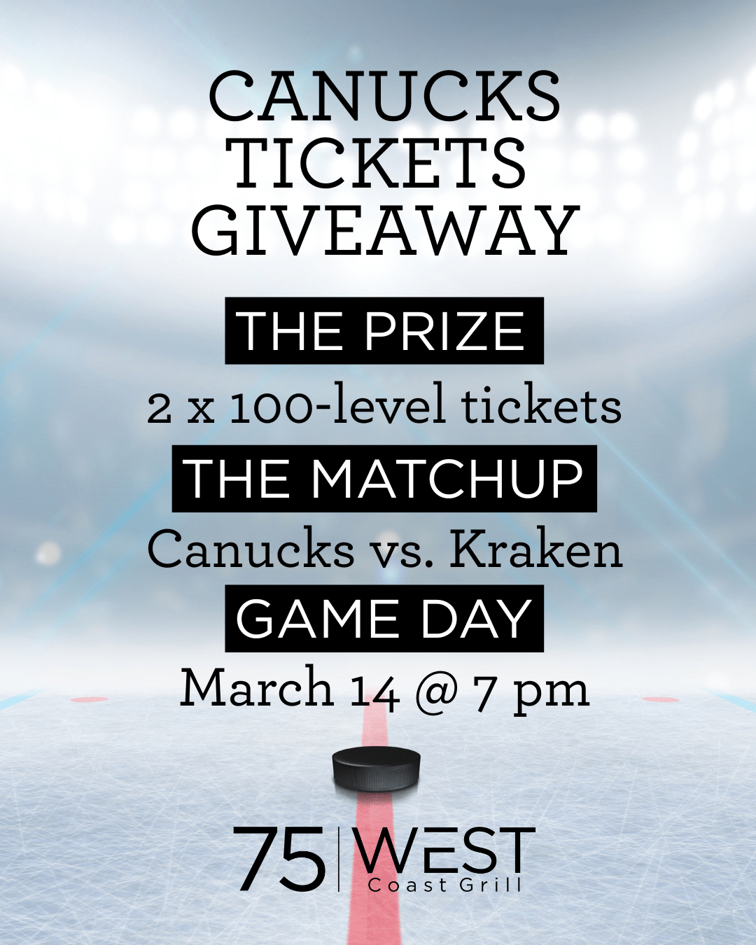Catch a Canucks game with us and you could win two lower-bowl tickets to Canucks vs. Kraken on March 14th*! Ask your server for an entry form.